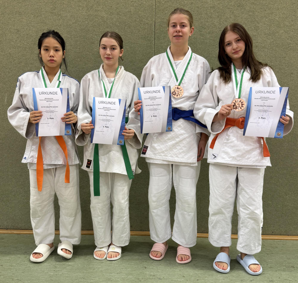 Im Anschluss konnten die älteren Mannschaften ihr Können unter Beweis stellen. Der PSV Schmölln ging mit dem PSV Erfurt als Kampfgemeinschaft an den Start. Pauline Alsted, Julia Heilmann, Valeria Eisenbart und Ha Linh Nguyen Dao, alle noch U15-startberechtigt, kämpften mit großer Motivation. In der ersten Runde konnte die Kampfgemeinschaft nicht gegen den PSC Bautzen ankommen und verlor 1:5. Im zweiten Duell standen die Thüringer der Kampfgemeinschaft Chemnitzer PSV / Ippon Rodewisch gegenüber. Hier punktete Valeria und zwei Erfurterinnen, so dass es 3:3 stand. Nach Auslosung der entscheidenden Gewichtklasse konnten die PSVer diesen Sieg und damit den Mannschaftserfolg mit 4:3 für sich entscheiden. Am Ende belegte die Kampfgemeinschaft den 3. Platz.
