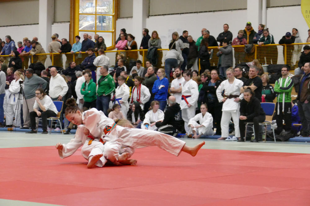 In der U18 war zuerst Valeria Eisenbart an der Reihe. Sie konnte ihre Techniken gut durchsetzen und besiegte souverän zwei Gegnerinnen. Im Einzug ins Finale musste sie sich allerdings geschlagen geben - somit Bronze für Valeria. Julia Heilmann und Yassmin Bär taten es Valeria gleich, konnten mit ihren Stand- und Bodentechniken die Kampfrichter überzeugen bis zum Halbfinale. Hier gelang es den beiden nicht, ihre Kontrahentinnen zu bezwingen. Ha Linh Nguyen Dao kämpfte in der zahlenmäßig größten Gewichtsklasse. Mit einem Sieg und zwei spannenden, aber verlorenen Partien erkämpfte sie Platz 5. Leonie Domke und Pauline Alsted konnten leider ihre Spezialtechniken nicht so gewinnbringend einsetzen. Nach drei Kämpfen stand Platz 7 für sie fest. In der U21 wollte Svenja Besoke ihre Chance nutzen. Ihre Gegnerinnen waren sehr stark. Teilweise ging sie zwar in Führung musste diese allerdings wieder abgeben. Letztlich belegte sie Platz 7. Die Trainerin Luise Engelmann und Ivo Schöne waren mit den Ergebnissen durchaus zufrieden, zumal die Mehrzahl der Schmöllner Kämpferinnen die jüngsten ihrer Altersklasse sind. Nun sind die Medaillengewinnerinnen Julia, Yassmin und Valeria auf die Deutschen Meisterschaften am 1. März in Leipzig gespannt und versuchen sich noch bestmöglich vorzubereiten.