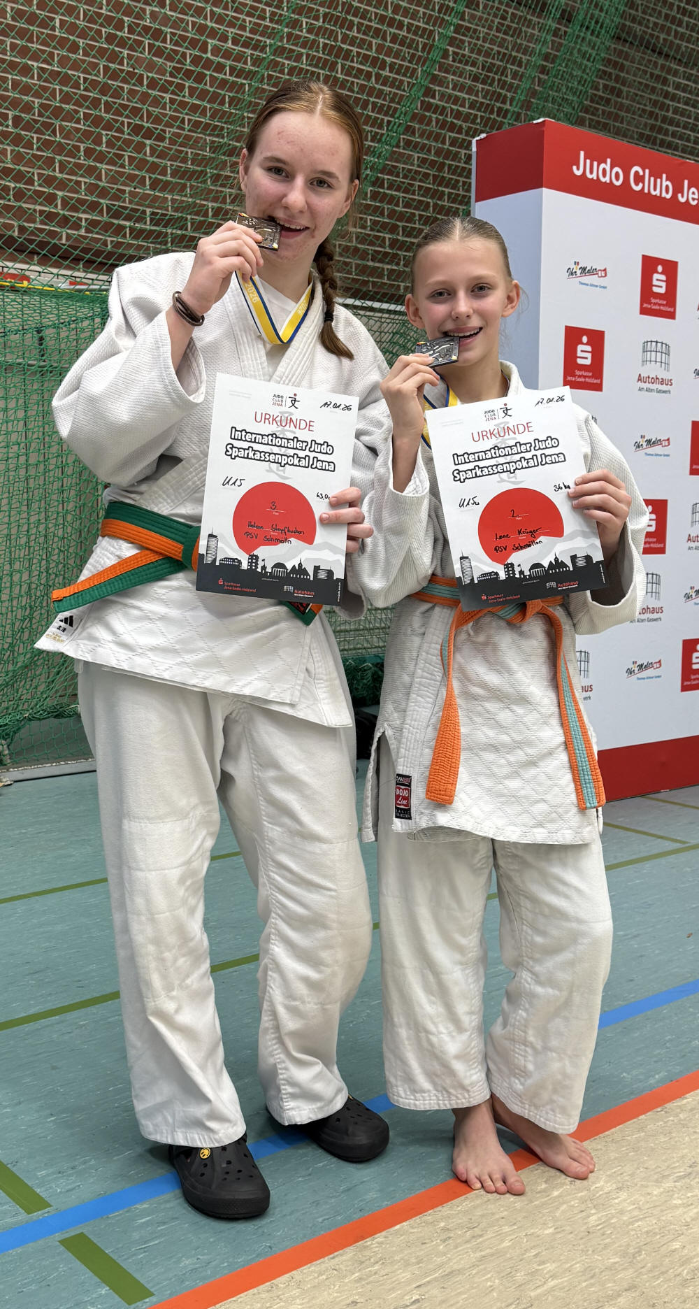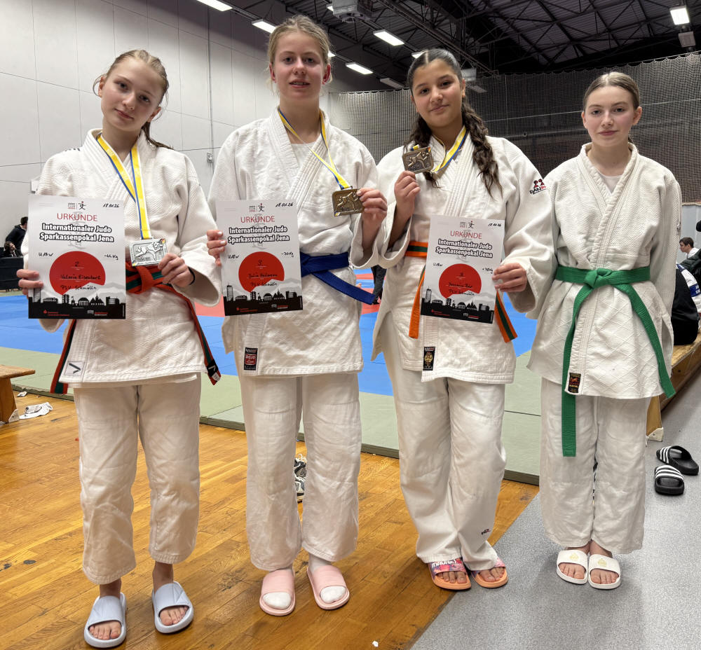 Mit 8 Sportlerinnen war der PSV Schmölln zum Jahresauftakt beim Internationalen Sparkassen-Cup in Jena vertreten. Mit über 800 Kämpfern und unter Beteiligung von Kämpfern aus Östereich war das Niveau sehr hoch. Am ersten Tag standen in der U15 Lene Krüger, Annika Sollner und Helene Stopfkuchen auf der Matte. Annika konnte leider verletzungsbedingt nicht punkten. Helene erreichte mit zwei Siegen und zwei Niederlagen Platz 3. Lene Krüger erkämpfte sich mit zwei Siegen und einer Niederlage Silber. Am zweiten Tag kämpfte in der Altersklasse U18 Valeria Eisenbart, Pauline Alsted, HaLinh Nygen, Julia Heilmann und Yassmin Bär. HaLinh und Pauline konnten an diesem Tag noch nicht überzeugen und blieben mit Platz 5 ohne Medaille. Valeria Eisenbart musste lediglich gegen die amtierende Deutsche Meisterin eine Niederlage einstecken und wurde Zweite. Mit zwei Dritten Plätzen durch Julia Heilmann und Yassmin Bär gelang der Einstand ins neue Wettkampfjahr