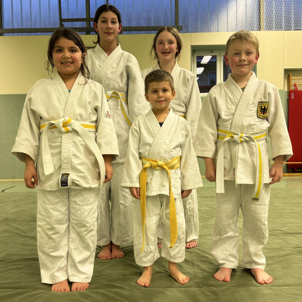 5 Judokas stellten sich ihrer ersten Prüfung zum Weiß-Gelben-Gürtel. Souverän meisterten sie diesen Schritt und dürfen nun den stolz den neuen Gürtel tragen. Bestanden haben Nari Salmi, Lilly Teske, Chalyna Steinhäuser, Arthur Schneider und Jason Olzscha.